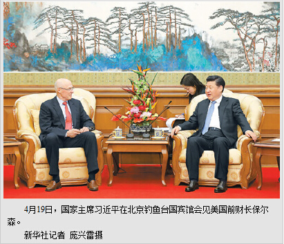本报北京4月19日电 (记者赵明昊)国家主席习近平19日在钓鱼台国宾馆会见美国前财长保尔森。