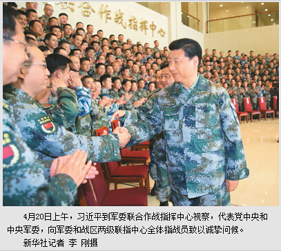 新华社北京4月20日电 (记者李宣良、黎云)中共中央总书记、国家主席、中央军委主席、军委联指总指挥习近平20日上午到军委联合作战指挥中心视察,代表党中央和中央军委,向军委和战区两级联指中心全体指战员致以诚挚问候。他强调,要以党在新形势下的强军目标为引领,贯彻新形势下军事战略方针,聚焦研究打仗、指挥作战这个核心职能,进一步解放思想、转变观念、开拓创新、攻坚克难,努力建设绝对忠诚、善谋打仗、指挥高效、敢打必胜的联合作战指挥机构,构建平战一体、常态运行、专司主营、精干高效的战略战役指挥体系,为实现中国梦强军梦提供坚强支撑。