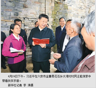 老区人民生活怎么样,习近平一直牵挂于心。24日下午,他沿着山路乘车1个小时,来到金寨县花石乡大湾村考察脱贫工作。在贫困户陈泽平、汪能保、汪达伟、汪达开、陈泽申家,习近平详细察看住房和陈设,了解贫困原因、贫困程度,通过扶贫手册看脱贫措施定了哪些、落实怎么样。当地干部沿途向总书记介绍茶园、鱼塘、小型光伏电站等扶贫项目,习近平一一询问生产经营、成本效益,同大家一起算脱贫时间账。
