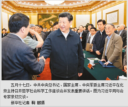 习近平指出,加强和改善党对哲学社会科学工作的领导,是繁荣发展我国哲学社会科学事业的根本保证。各级党委要把哲学社会科学工作纳入重要议事日程,加强政治领导和工作指导,一手抓繁荣发展、一手抓引导管理。各级领导干部特别是主要负责同志,既要有比较丰富的自然科学知识,又要有比较丰富的社会科学知识,以不断提高决策和领导水平。要加强中国特色新型智库建设,建立健全决策咨询制度。