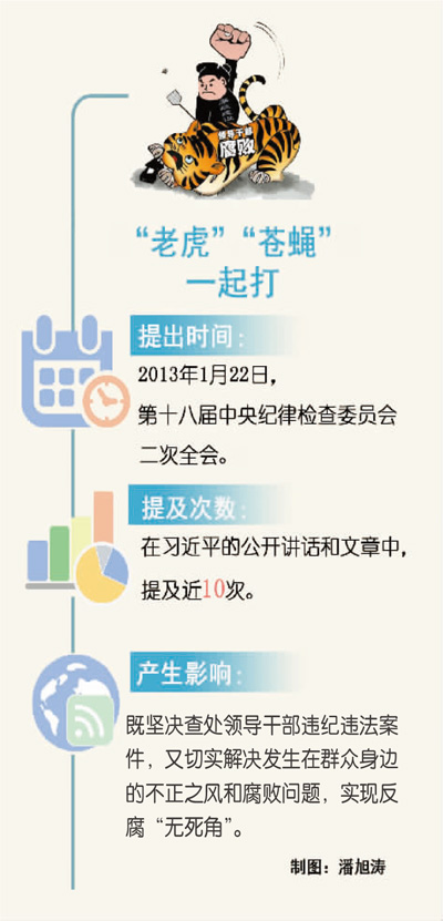 “要坚持‘老虎’‘苍蝇’一起打,既坚决查处领导干部违纪违法案件,又切实解决发生在群众身边的不正之风和腐败问题。”2013年1月,习近平在十八届中央纪委二次全会上提出了这一关于反腐的具体要求。