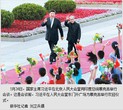 本报北京5月26日电 (记者杜一菲)国家主席习近平26日在人民大会堂同印度总统慕克吉举行会谈。两国元首同意共同努力,发扬中印文明互鉴传统,加强两国全面合作,将中印战略合作伙伴关系推向新高度,促进双方共同发展,为地区和世界和平与繁荣作出更大贡献。