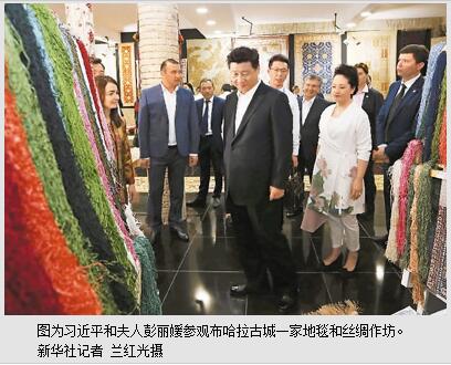 习近平和彭丽媛走进波依卡扬建筑群旁的一家地毯和丝绸作坊。纺织女工们正在制作布哈拉传统手工地毯,用娴熟的技艺织成色彩斑斓的图案。