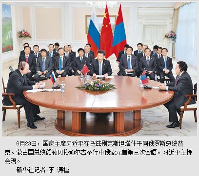 习近平指出,中俄蒙三方依托互为邻国的优势开展紧密合作,积极落实《中俄蒙发展三方合作中期路线图》,在经贸、人文、过境运输、旅游、体育等领域取得积极进展和成果。中方对三方合作势头感到满意。我们要继续围绕中方丝绸之路经济带建设、俄方发展战略特别是跨欧亚大通道建设、蒙方“草原之路”倡议对接这条主线,积极推进三方全面合作。