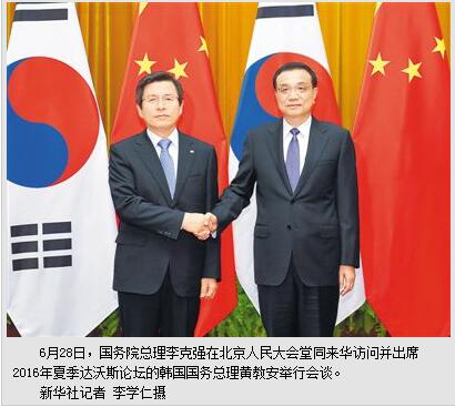 本报北京6月28日电 (记者杜一菲)国务院总理李克强28日下午在人民大会堂同来华访问并出席2016年夏季达沃斯论坛的韩国国务总理黄教安举行会谈。