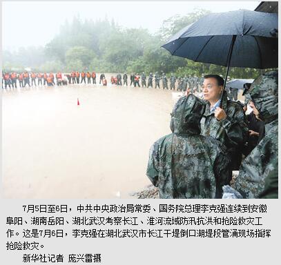 新华社武汉7月6日电 (记者陈二厚)7月5日至6日,中共中央政治局常委、国务院总理李克强连续到安徽阜阳、湖南岳阳、湖北武汉考察长江、淮河流域防汛抗洪和抢险救灾工作。