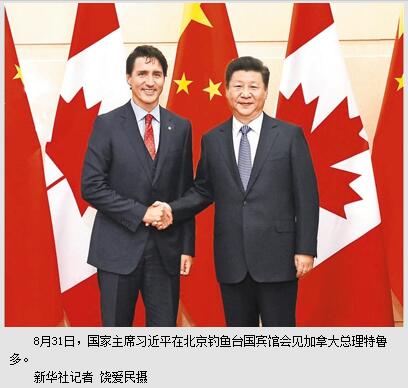 特鲁多表示,我此次访华使人联想起我父亲当年访华并推动加中建交的历史。加方高度评价中国几十年来取得的巨大发展成就,对同中方在经贸、人文等各领域关系发展迅速感到高兴。当前形势下,两国关系重回强劲、稳健的发展轨道不仅造福两国人民,也有利于世界的和平与发展。加方致力于深化同中方在经贸、投资、执法等领域合作,决定申请加入亚洲基础设施投资银行,密切加中在多边事务中协调合作。加方赞同二十国集团领导人杭州峰会聚焦创新和包容性增长等议题,加强国际合作应对全球性挑战,将支持中方成功举办杭州峰会。