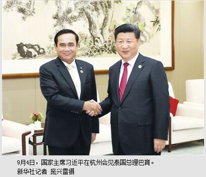 习近平指出,中泰一家亲。中方高度重视发展中泰友好关系,愿同泰方一道,推动两国全面战略合作不断迈上新台阶。中泰都是亚洲重要的发展中国家,都面临着发展经济、改善民生、维护稳定的重要任务。中泰双方要加强战略沟通,加强发展战略对接,大力推进两国各领域互利合作,扩大人员往来,加强在多边框架内的协调和配合。巴育总理以七十七国集团轮值主席国领导人身份出席二十国集团领导人杭州峰会,体现了广大发展中国家对中国主办峰会的支持。中方期待同泰方一道努力,推动峰会取得成功。