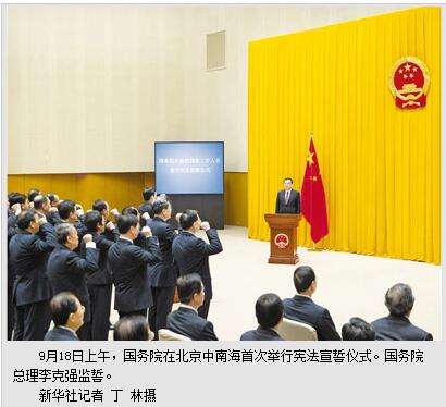 新华社北京9月18日电 9月18日上午,国务院在中南海首次举行宪法宣誓仪式。国务院总理李克强监誓。