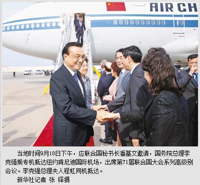 李克强抵达纽约出席第71届联合国大会系列高级别会议