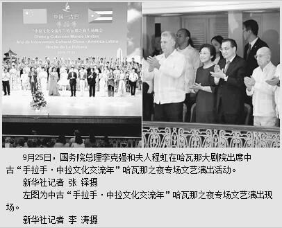 本报哈瓦那9月25日电 (记者吴乐珺、王骁波)当地时间25日晚,国务院总理李克强和夫人程虹在哈瓦那大剧院出席中古“手拉手·中拉文化交流年”哈瓦那之夜专场文艺演出活动。受正在国外的古巴国务委员会主席兼部长会议主席劳尔·卡斯特罗委托,古共中央第二书记、国务委员会副主席马查多,国务委员会第一副主席兼部长会议第一副主席迪亚斯—卡内尔陪同出席。