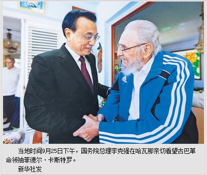 本报哈瓦那9月26日电 (记者吴乐珺、王骁波)国务院总理李克强当地时间25日下午在哈瓦那亲切看望古巴革命领袖菲德尔·卡斯特罗。双方就中古关系以及世界和平、地区热点、粮食安全等共同关心的广泛议题深入交换意见,进行了长时间交谈。李克强总理夫人程虹参加会见。