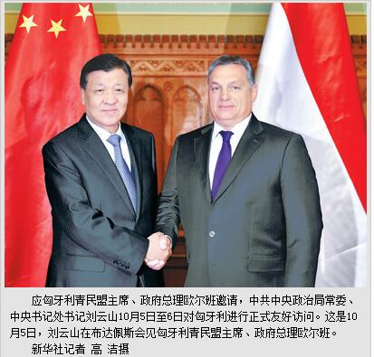 新华社布达佩斯10月7日电 (记者李忠发、杨永前)应匈牙利青民盟主席、政府总理欧尔班邀请,中共中央政治局常委、中央书记处书记刘云山5日至6日对匈牙利进行正式友好访问,在布达佩斯分别会见匈牙利总统阿戴尔,青民盟主席、政府总理欧尔班和国会主席克韦尔。