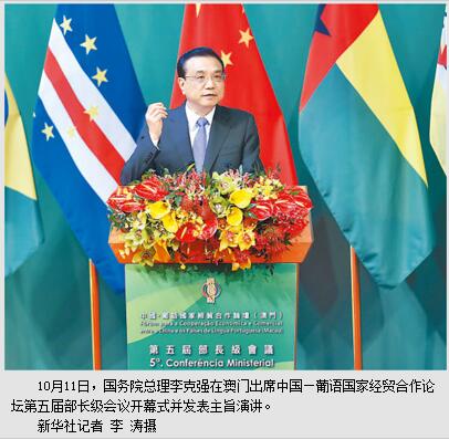 本报澳门10月11日电 (记者苏宁、吴乐珺)国务院总理李克强11日上午在澳门出席中国—葡语国家经贸合作论坛第五届部长级会议开幕式并发表主旨演讲。佛得角总理席尔瓦、几内亚比绍总理巴西罗·贾、莫桑比克总理多罗萨里奥、葡萄牙总理科斯塔以及安哥拉、巴西、东帝汶等国政府代表与会并讲话。