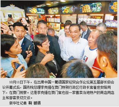 本报澳门10月12日电 (记者苏宁、吴乐珺)在出席中国—葡语国家经贸合作论坛第五届部长级会议开幕式后,国务院总理李克强11日下午在澳门特别行政区行政长官崔世安陪同下,在澳门视察。
