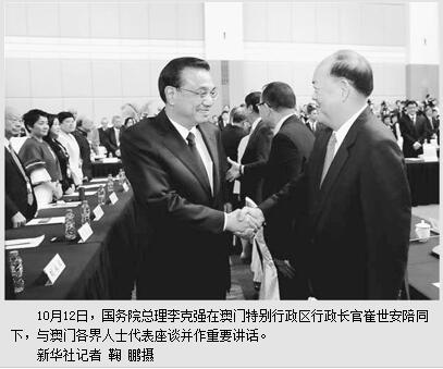 本报澳门10月12日电 (记者苏宁、吴乐珺)国务院总理李克强12日上午在澳门特别行政区行政长官崔世安陪同下,与澳门各界人士代表座谈并作重要讲话。