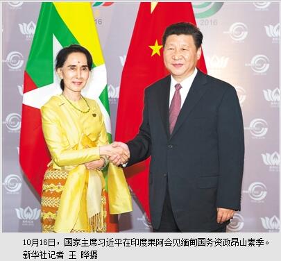 本报印度果阿10月16日电 (记者杜尚泽、邹松)国家主席习近平16日在印度果阿会见缅甸国务资政昂山素季。