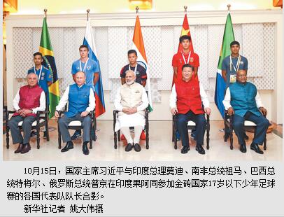 习近平同参加金砖国家少年足球赛的各国代表队队长合影