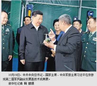 本报北京10月19日电 (记者刘志强)中共中央总书记、国家主席、中央军委主席习近平19日在北京参观第二届军民融合发展高技术成果展。他强调,军民融合是国家战略,关乎国家安全和发展全局,既是兴国之举,又是强军之策。军民融合不断取得阶段性成果,呈现出加快发展良好态势。要继续推动体制机制改革创新,从需求侧、供给侧同步发力,从组织管理、工作运行、政策制度方面系统推进,继续把军民融合发展这篇大文章做实,加快形成军民深度融合发展格局,切实打造军民融合的龙头工程、精品工程,为实现中国梦强军梦作出新的更大的贡献。