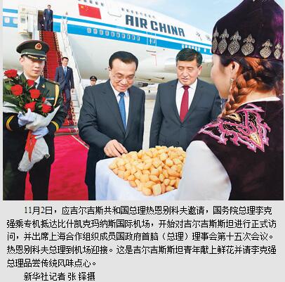 新华社北京11月2日电 应吉尔吉斯共和国总理热恩别科夫、哈萨克斯坦共和国总理萨金塔耶夫、拉脱维亚共和国总理库钦斯基斯、俄罗斯联邦政府总理梅德韦杰夫邀请,国务院总理李克强于2日上午乘专机离开北京,对吉尔吉斯斯坦进行正式访问并出席上海合作组织成员国政府首脑(总理)理事会第十五次会议、对哈萨克斯坦进行正式访问并出席中哈总理第三次定期会晤、对拉脱维亚进行正式访问并出席第五次中国—中东欧国家领导人会晤、对俄罗斯进行正式访问并出席中俄总理第二十一次定期会晤。