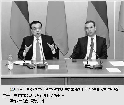 本报圣彼得堡11月7日电 (记者吴乐珺、曲颂)国务院总理李克强当地时间7日下午在圣彼得堡康斯坦丁宫与俄罗斯总理梅德韦杰夫共同会见记者,并回答提问。