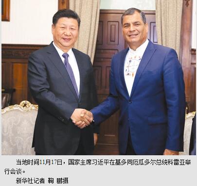 科雷亚表示,习近平主席此次对厄瓜多尔国事访问更像是一次朋友间的聚会,相信此访将加强两国关系,深化双边合作,为两国人民带来更大福祉。厄方感谢中方对厄瓜多尔抗震救灾和灾后重建给予的有力支持。厄方始终坚持一个中国政策,致力于加强两国在政治、经贸、人文领域交流合作。作为七十七国集团明年轮值主席,厄方将推动“七十七国集团加中国”在多边机构中更加密切地合作。
