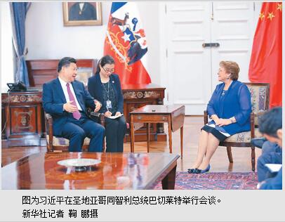 据新华社圣地亚哥11月22日电 (记者王聪、刘华、蒋国鹏)国家主席习近平22日在圣地亚哥同智利总统巴切莱特举行会谈。两国元首积极评价中智关系发展,一致决定将两国关系定位提升为中智全面战略伙伴关系,推动中智关系得到更大发展。