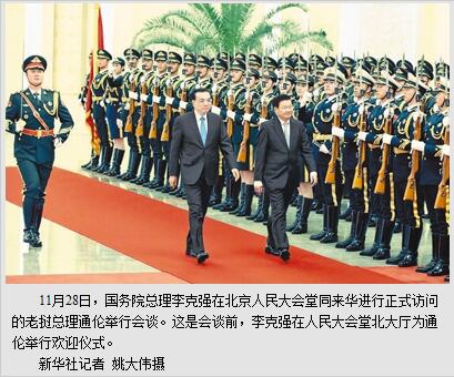 本报北京11月28日电 (记者杨迅)国务院总理李克强28日下午在人民大会堂同来华进行正式访问的老挝总理通伦举行会谈。