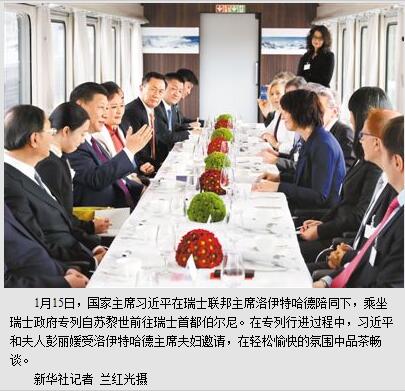 习近平感谢洛伊特哈德主席夫妇专程赴苏黎世机场迎接他和夫人彭丽媛,高度评价洛伊特哈德主席多年来致力于促进中瑞各领域友好互利合作。