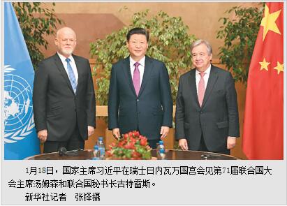 本报瑞士日内瓦1月18日电 (记者杜尚泽、任彦)18日,国家主席习近平在日内瓦万国宫会见第71届联合国大会主席汤姆森和联合国秘书长古特雷斯,强调中国坚定走多边主义道路,捍卫联合国宪章宗旨和原则,支持联合国为维护世界和平、促进共同发展发挥更大作用。