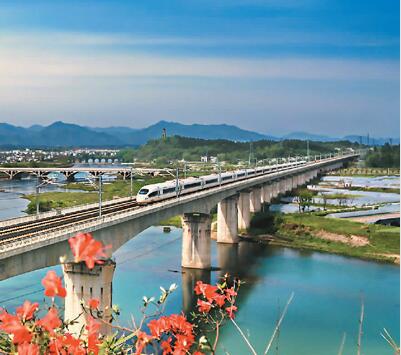 近日,全国各地春光明媚,山花烂熳。在中国最美高铁合福线新安江休宁古城岩大桥,古塔、古桥、新安江和疾驰而过的动车交相辉映,美景如画。图为一列动车驶过古城岩大桥。