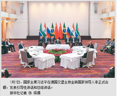 本报德国汉堡7月7日电 (记者杜尚泽、管克江、黄发红)国家主席习近平7日在汉堡主持金砖国家领导人非正式会晤,发表引导性讲话和总结讲话。南非总统祖马、巴西总统特梅尔、俄罗斯总统普京、印度总理莫迪出席。5国领导人围绕世界政治经济形势和二十国集团重点议题深入交换意见,就金砖国家加强团结协作、合力构建开放型世界经济、完善全球经济治理、促进可持续发展达成重要共识。