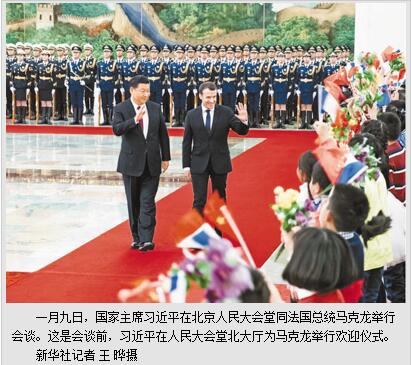 习近平指出,马克龙总统是2018年第一位访华的外国元首,也是中共十九大后到访中国的第一位欧洲国家元首。中法关系具有独特历史和丰富内涵。近年来,中法关系持续高水平发展,更加成熟稳定和富有活力。两国关系正处在新起点上。中方愿同法方增进交往,深化互信和合作,为中法全面战略伙伴关系发展注入新动力。