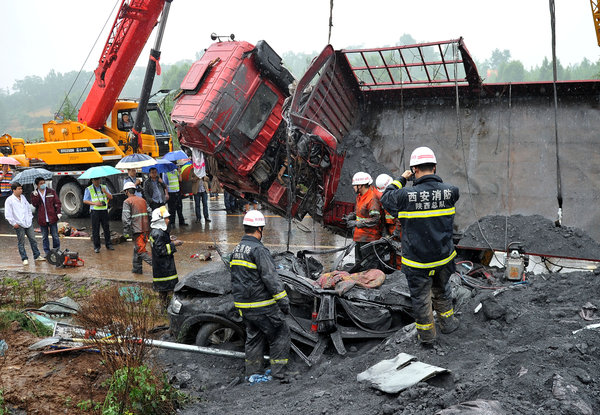 2013年5月25日上午,西安环山路长安区段(107省道)与甫十路十字发生一起特大交通事故,一辆重型拉煤货车与一辆雪佛兰轿车会车时侧翻,雪佛兰轿车被压在拉煤车下,一车煤又将小车掩埋……事故造成小轿车内6人4死2伤。
