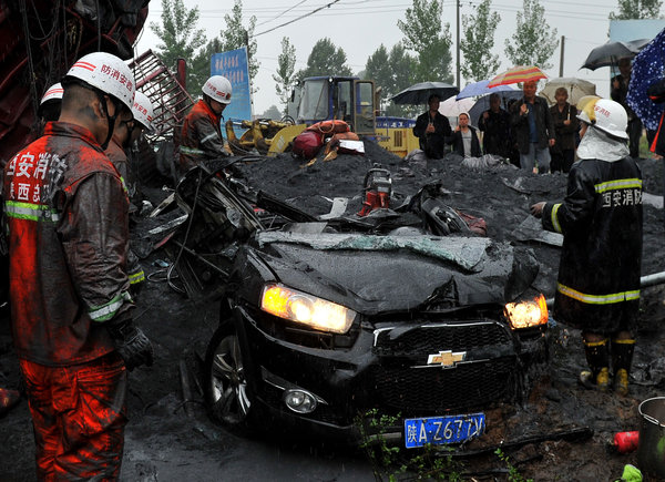 轿车车身已被压扁,周围是大堆的煤块,隐约可见车牌号为陕AZ677V。消防队员正在切割轿车车厢救援受困者。
