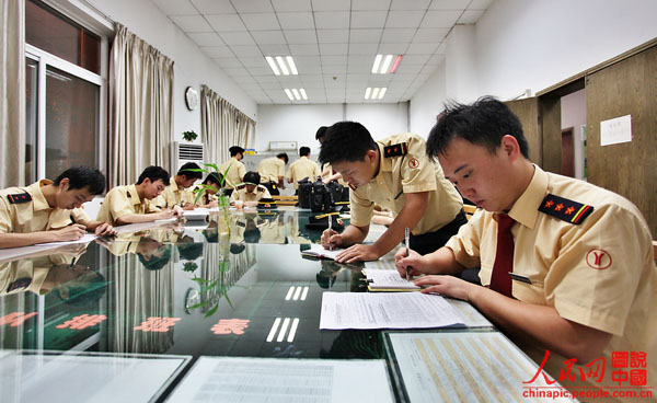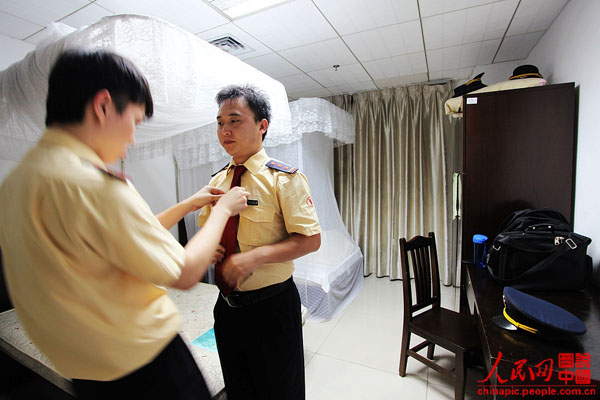 右侧是的谭海涛,左侧帮他整理领带的是他这日的搭班同事葛铭。由于整个宿舍比较简单,只有三个床,一个书桌和一个放被子的柜子以及一个简单到不能再简单的洗手间。