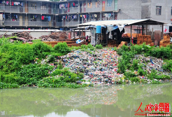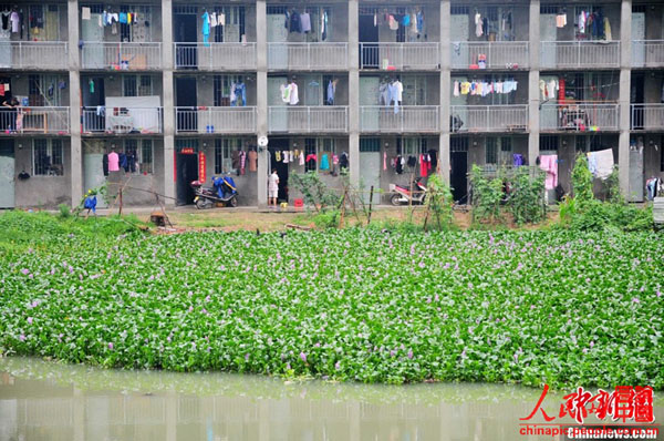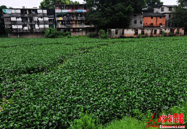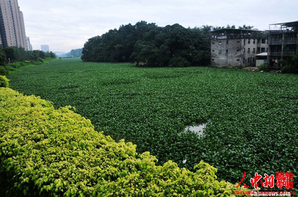 6月14日,福州金山流花溪下游高宅段宽约近30米的河面被水浮莲覆盖,蔓延1公里左右,河岸一边堆着各式生活垃圾,恶臭难闻,水中的鱼虾基本绝迹。附近的住户告诉记者,几年前他们搬到这里时,流花溪还比较清澈,天热的时候还能在溪边的凉亭里乘凉。可是后来附近的一些工厂和居民往河里排放生活垃圾和污水,造成水体富营养化,水浮莲也开始疯长。如今,流花溪却从河水清澈、水鸟嬉戏的乌龙江支流,变成了水浮莲垃圾遍布的臭水河。