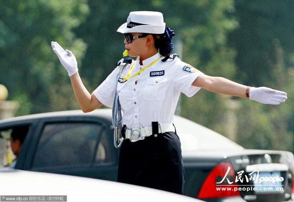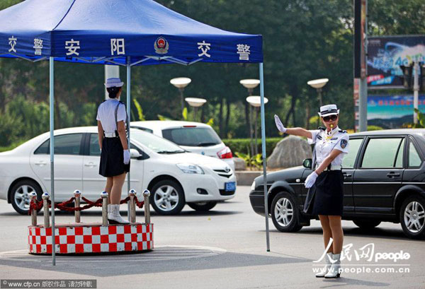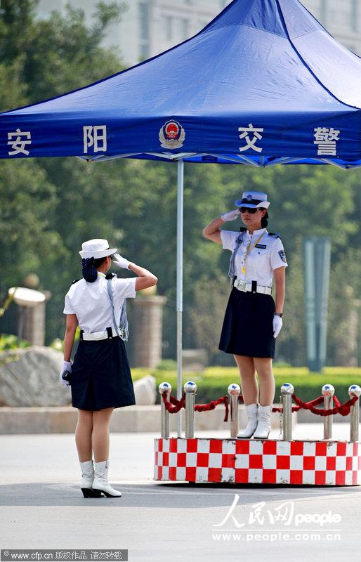 2013年6月16日,河南省安阳市街头,身着夏装的女协警顶着太阳在炎热的天气指挥交通。王子瑞/CFP
