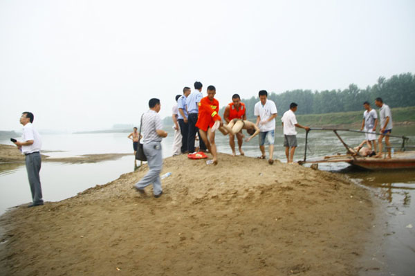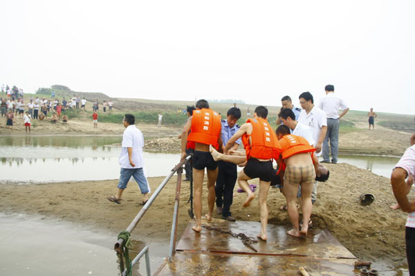 一艘橡皮艇正在江面来回搜救,旁边是一艘民用机动船,上面的救援人员,拿着竹竿在水下搜寻。河流两边各有一名救援人员,牵着手中的滚钩,不停地来回走动。据介绍,从下午两点50分至4点50分,先后从水中搜寻到3名学生,随后被送往殡仪馆。另外3名还没找到的学生的家长,在亲人的搀扶下,站在岸边等候。