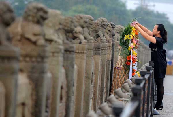 7月7日,一名参加活动的青年党员在卢沟桥上整理花篮。