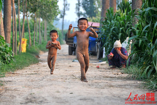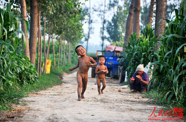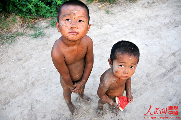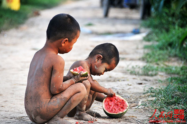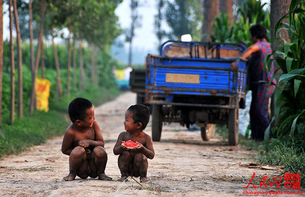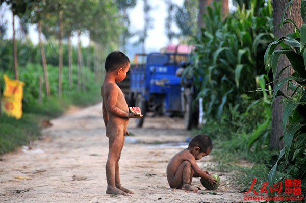 7月31日,尉氏县的两个留守儿童在地头儿玩耍。他们赤裸着身体,在尘土飞扬的乡间小路上奔跑嬉戏,浑身沾满了泥土,却仍然抱着一块儿西瓜吃得津津有味,笑容天真无邪。
