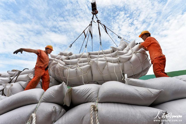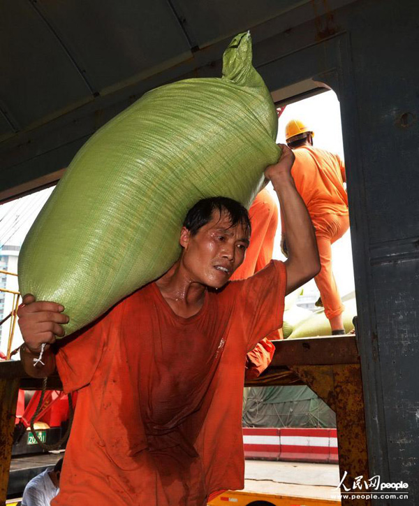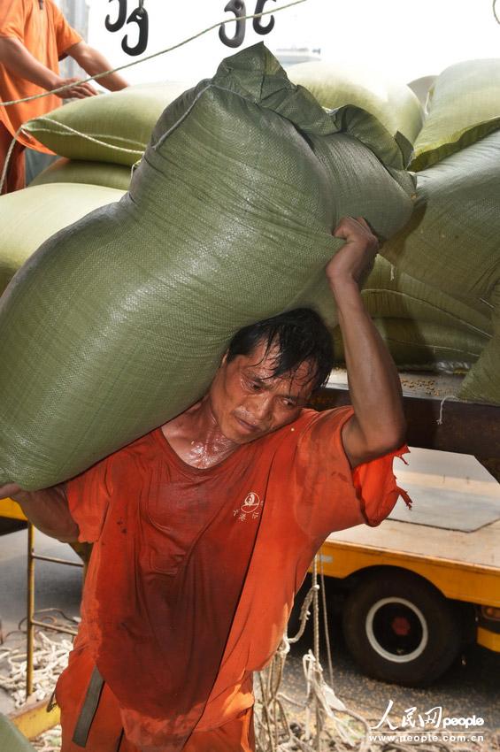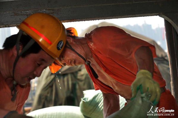 “工人伟大、劳动光荣”组图:高温下的青岛港码头工人。(人民日报记者 雷声摄影报道)