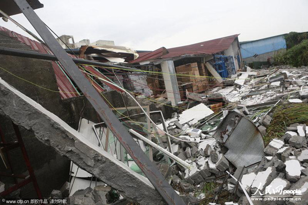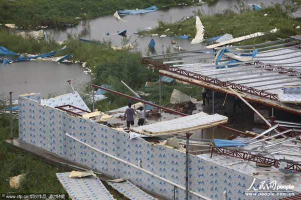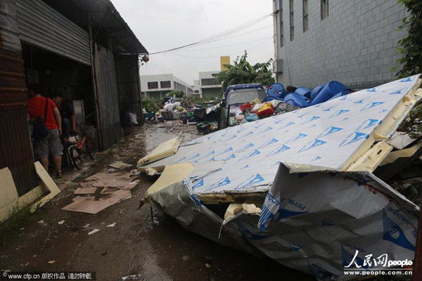 2013年8月15日,广东东莞,一块巨大的铁皮被龙卷风裹挟飞跃200米,砸中了下班回家的单亲妈妈黄秀妹。苏仕日/CFP