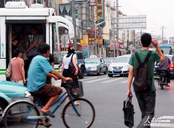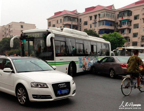 上海:十字路口私家车“顶”公交不相让 下班高峰引拥堵