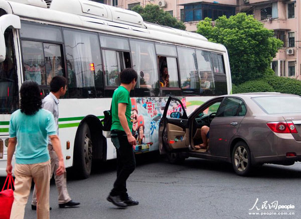 2013年8月30日下午,上海政民路国定路口发生一起交通事故,99路公交车与一私家车发生碰撞停在十字路口,下班高峰期间,交通拥堵。狼狼/东方IC