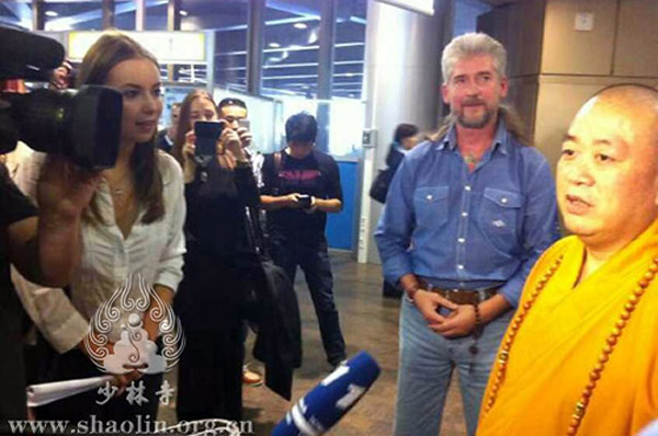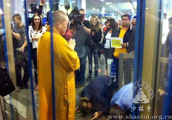 当地时间8月28日下午,释永信方丈一行抵达莫斯科,受到当地少林弟子、信众及各界人士的热烈欢迎。俄罗斯少林“洋弟子”们向永信方丈行跪拜礼,并献上鲜花,欢迎大家莅临莫斯科参加国际军乐节活动。