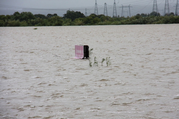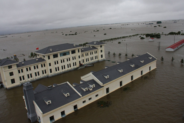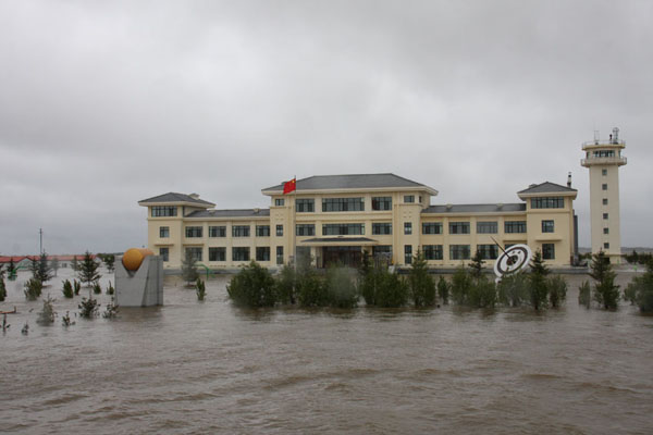记者在“东极哨所”看到,这里已经全部被洪水漫过,篮球架只剩半截露出水面,战士们走出楼门就要乘上冲锋舟;建在境内制高点的4层营房,本来露出地面半层多的地下室,已经几乎被淹没;安置净水器和发电机的锅炉房,门窗已用沙袋和防水布筑起一米多高的防护墙,抽水机不断将渗进屋内的水抽排到外面。
