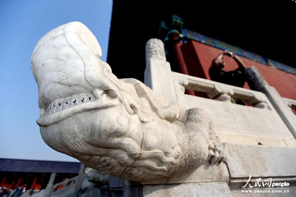 近日,有市民在世界文化遗产天坛公园发现有人乱写乱画,园内祈年门台基上的一尊汉白玉螭(chī)首遭人为涂损。