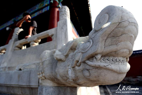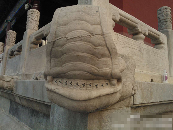 祈年门台基四角,建筑外部、栏板之下,各伸出一尊威猛雄浑的汉白玉兽头。其造型为口张开、上吻高抬、瞪目前方,表面凹凸有致,线条流畅饱满,这便是螭首。