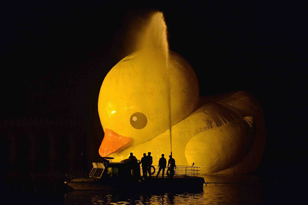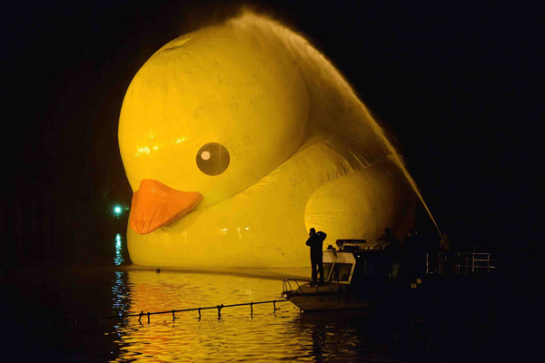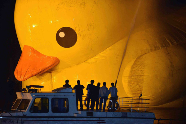 由于北京10月10日出现大风天气,颐和园启动大黄鸭防风预案,将大黄鸭人工放气,避免其遭受大风损害。经过一天检修,颐和园11日晚间开始为大黄鸭充气,并安排消防艇为黄鸭“冲澡”。12日,大黄鸭将以新的面貌继续在颐和园展出,与公众见面。
